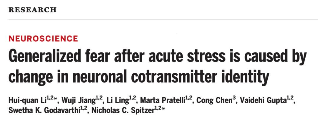 2024年3月14日,加州大学圣地亚哥分校的 Nicholas Spitzer 教授、李慧泉博士等在国际顶尖学术期刊 Science 期刊发表了题为:Generalized fear after acute stress is caused by change in neuronal cotransmitter identity 的研究论文。