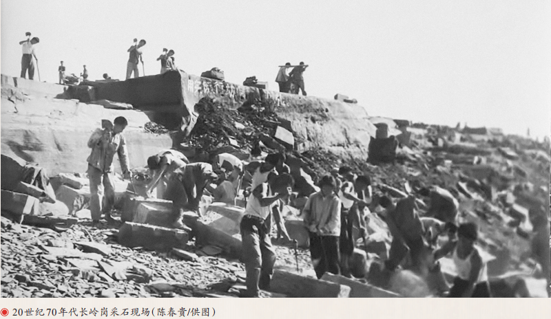 《旧唐书·地理志》青石县:“以县界有青石祠为名。”《太平寰宇记》 卷87青石县:“以界内有青石山为名。”“青石县……出青石,可以为磬。”“此山,天下青石无佳于此,可为钟磬。”事实上,大岩洞东侧的长岭岗周边除鲤鱼石、洗布石、五虎石、莲花石之外,其中段有长约500米、宽约60米巨石,如巨鱼脊背,石质坚硬,表面呈青灰色,纹理纵横交错,长岭岗也可以说是一座石山。1976年潼南举全县之力修建三块石水电站,从三块石至姬家坝、花滩桥、桂花口、姜家坝、大岩洞、观音场开凿引水渠道,渠长约15千米、宽约30米。长岗岭部分被开凿成渠道,该段工程由复兴团(修电站时全县以村为连、公社为营、区为团进行管理)负责,施工难度异常艰巨,其中一段长300米,石山下端10米深处石色为青黑,块状层层叠叠,石质尤为坚硬,铁锤钢钎开凿溅出火花,敲击发出清脆响声,石工周身沾满黑灰,洗脸、洗澡、洗衣之水均为青黑色。此外,三块石建设指挥部在大岩洞、五虎石等地开设石场,万名石工在此开凿3年,为三块石水利工程源源不断开采石料,长岭岗区域的多处巨石从此消失。如今,去冲沙闸旁的佛耳岩陡岩边、大岩洞旁音乐百花园内,还能看到当年开凿岩石的部分痕迹,在长岭岗段渠河两岸也能找到当年开凿留下的小块青石。