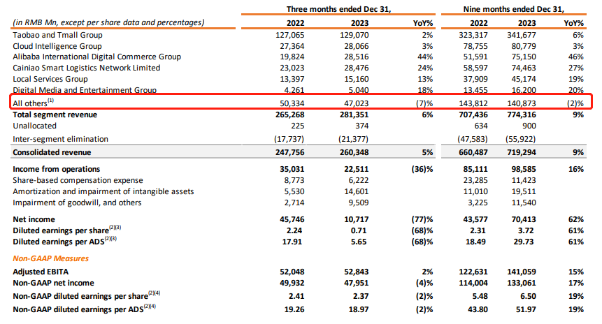 阿里2024财年第三季度财报显示,第三季度营收为2603.48亿元,同比增长5%。净利润为107.17亿元,同比下滑77%;包括高鑫零售、盒马、银泰等业务的“所有其他”实现营收470.23亿元,同比下滑7%。该部分净亏损31.72亿元,同比扩大87%。