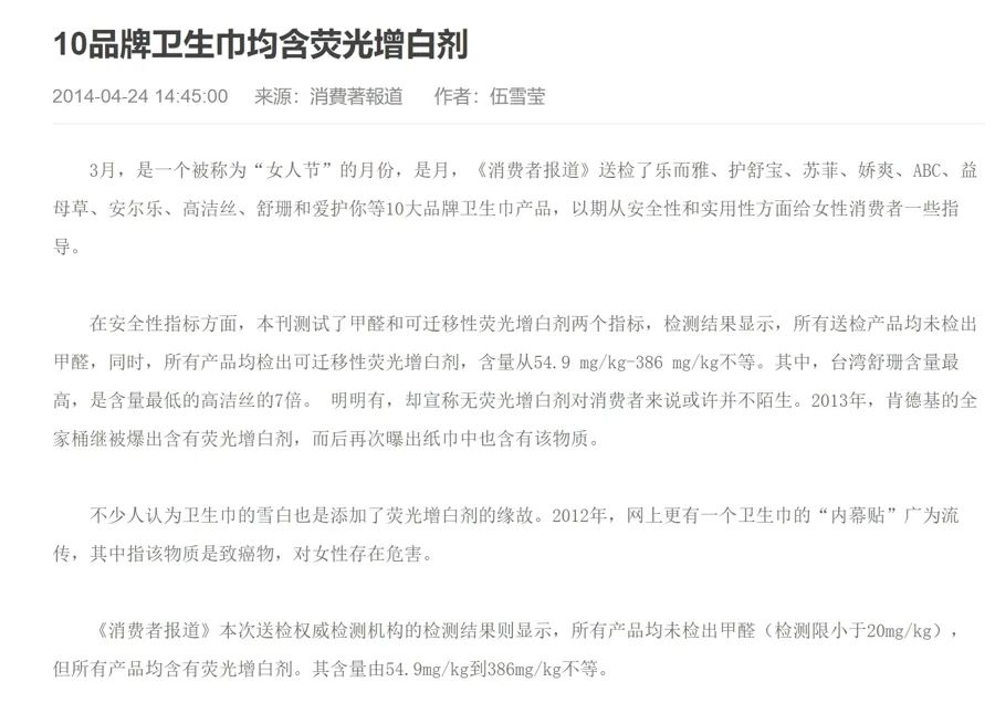 文章虽然指出在送检产品中查出了荧光增白剂,但也承认“目前卫生巾国标《GB/T 893-2008卫生巾(含卫生护垫)》中并未对卫生巾中的甲醛和荧光增白剂等物质做出任何规定,无论是含量,还是检测方法,都处于空白状态”,以及“对于荧光增白剂对正常人体的危害,目前还没有确实的证据证明”。