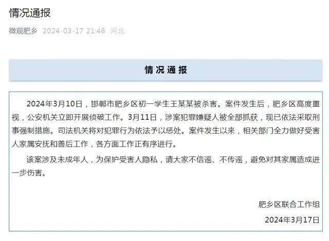 2024年3月10日,邯郸市肥乡区初一学生王某某被杀害。案件发生后,肥乡区公安机关立即开展侦破工作。3月11日,涉案犯罪嫌疑人被全部抓获,现已依法采取刑事强制措施。司法机关将对犯罪行为依法予以惩处。