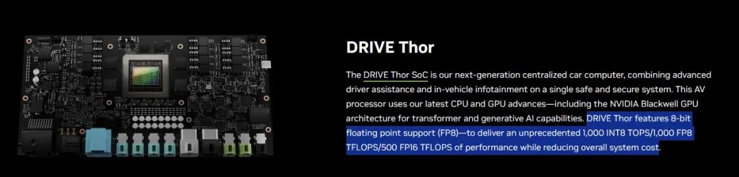 比如说,在算力方面,2022 年 9 月,DRIVE Thor 发布之时,官方主要宣称它的 AI 算力高达 2,000 TOPS,同时它也可以提供每秒 2,000 万亿次浮点运算性能。