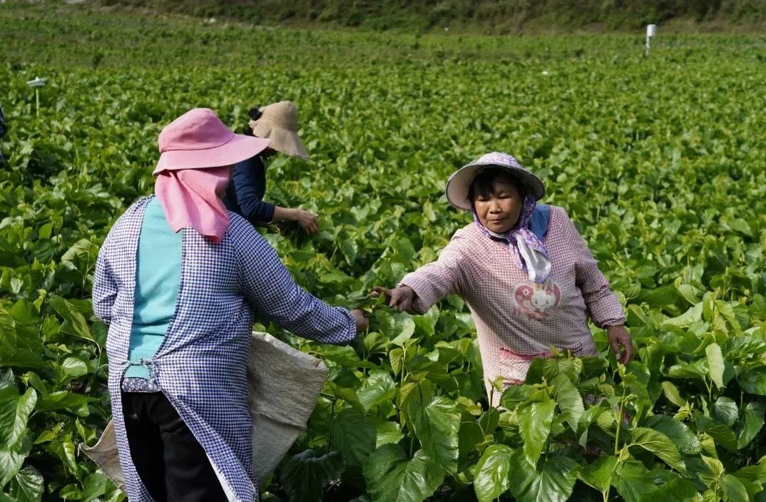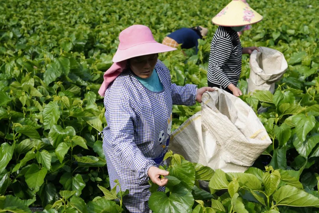 “大家摘桑叶的时候要摘嫩一点的,适合喂蚕宝宝。”“第四第五瓣叶子是比较好的。”“看准合适的叶子摘,这样就快一些。”当天共8名工人采摘桑叶,他们互相传授经验,采叶、装袋,摘得又好又快。“采摘的时候选(桑)芽往下的第五、第六瓣叶子,它在阳光下呈黄绿色。蚕宝宝刚孵化出来时牙齿不够坚硬,如果叶子过老,容易磕到蚕宝宝的牙。”基地负责人银红艳介绍道,刚孵化的蚕也只吃桑叶的叶面,桑叶纤维暂时还不能吃,从一龄蚕到三龄蚕需要8天时间。