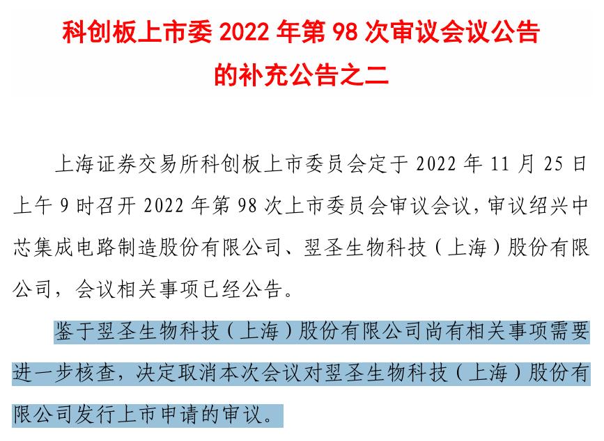 第二次补充公告为:鉴于翌圣生物尚有相关事项需要进一步核查,决定取消本次会议对其发行上市申请的审议。