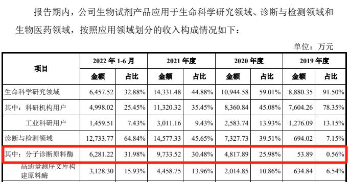 翌圣生物自2020年开始业绩大增,主要是其与核酸检测相关的分子诊断原料酶收入,从2019年53.89万元升至2020年4817.89万元,同比增长8840.23%;2021年该业务收入9733.52万元,相较2020年增长102.03%。