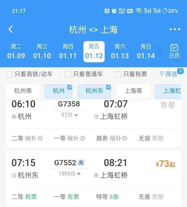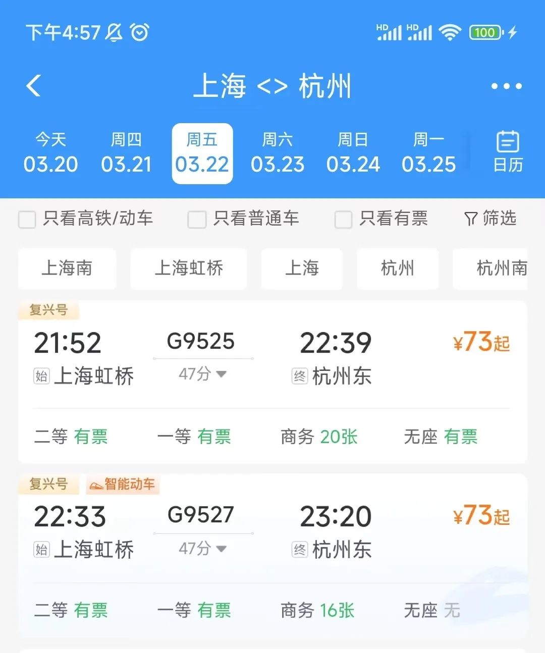 从售票情况来看,G9527次列车每天都会开行。相较于之前的末班时间,沪杭高铁上海往杭州方向的末班延迟了1小时左右。此外,周五和周日的晚间,还会加开一列从上海开往杭州方向的高铁,为G9525次列车,21点52分从上海虹桥站发车,中途不停,22点39分到达杭州东站。