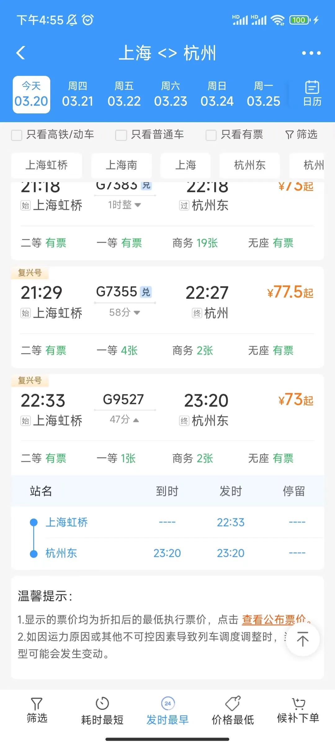 3月20日下午,在铁路12306App上进行查询,可看到沪杭高铁当天从上海往杭州方向的末班车为G9527次列车,22点33分从上海虹桥站发车,中途不停靠任何车站,23点20分到达杭州东站,全程耗时47分钟,二等座票价为73元。