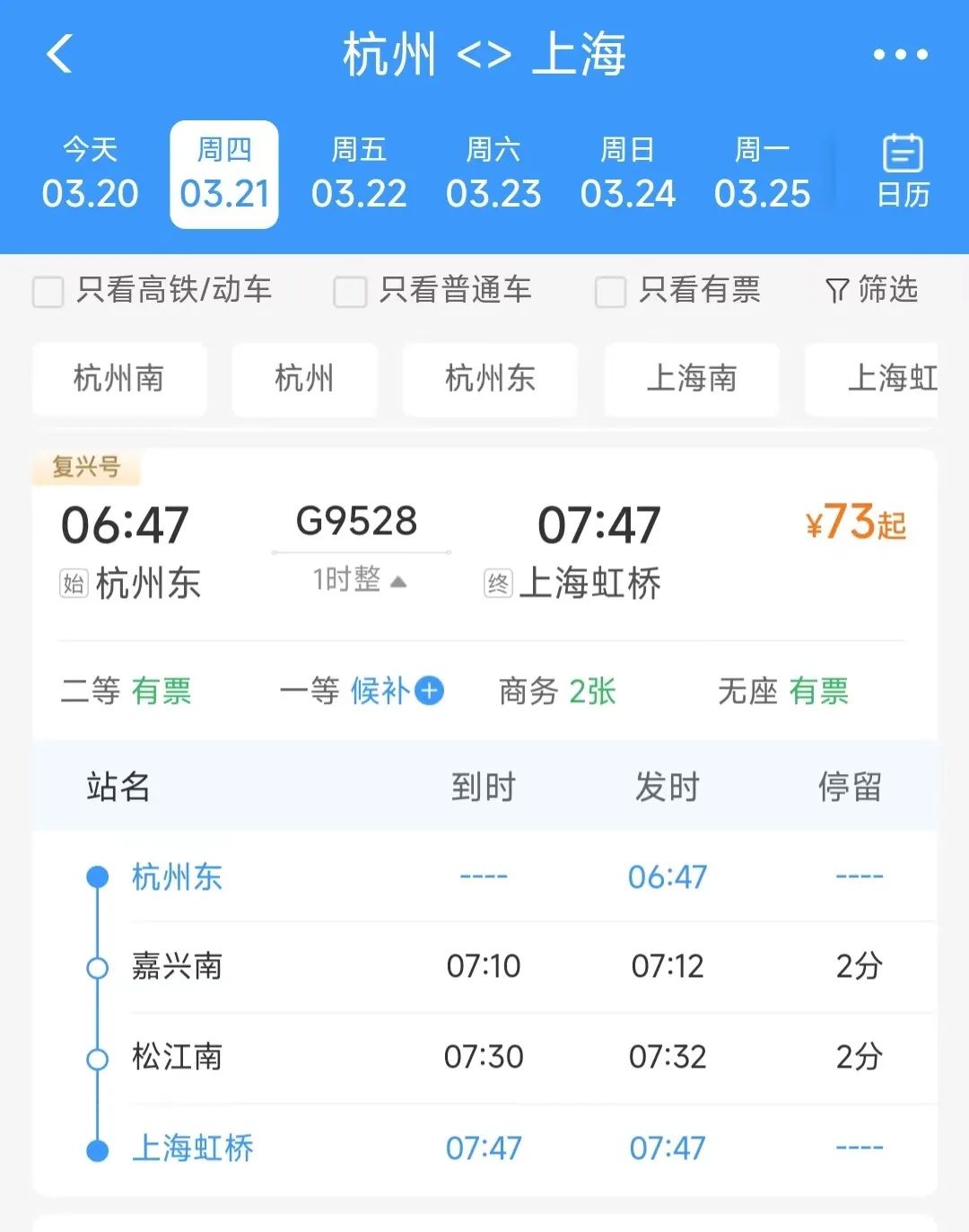 但需要提醒大家,G9528次列车同样是铁路春游运输期间加开的,后续是否持续开行尚不确定。杭州与上海之间