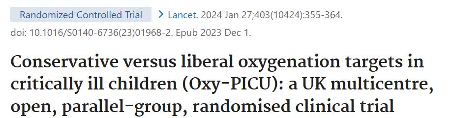 Conservative versus liberal oxygenation targets in critically ill children (Oxy-PICU): a UK multicentre, open, parallel-group, randomised clinical trial. Lancet. 2024 Jan 27;403(10424):355-364. doi: 10.1016/S0140-6736(23)01968-2. Epub 2023 Dec 1. Erratum in: Lancet. 2024 Jan 27;403(10424):354. PMID: 38048787.