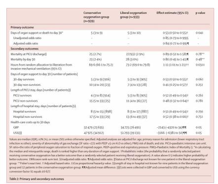主要与次要终点研究表明,在急诊入住PICU接受有创机械通气和辅助供氧的儿童中,与常规治疗(SpO 2>94%)相比,采用保守氧疗目标(SpO 2 88-92%)的器官支持持续时间或30天时的死亡有所改善。将SpO2 88-92%的保守氧疗饱和度目标广泛采用,且没有发现任何与使用保守氧疗相关的临床重要损害。因此,这些发现支持接受有创机械通气的危重患儿的SpO 2目标为88-92%。