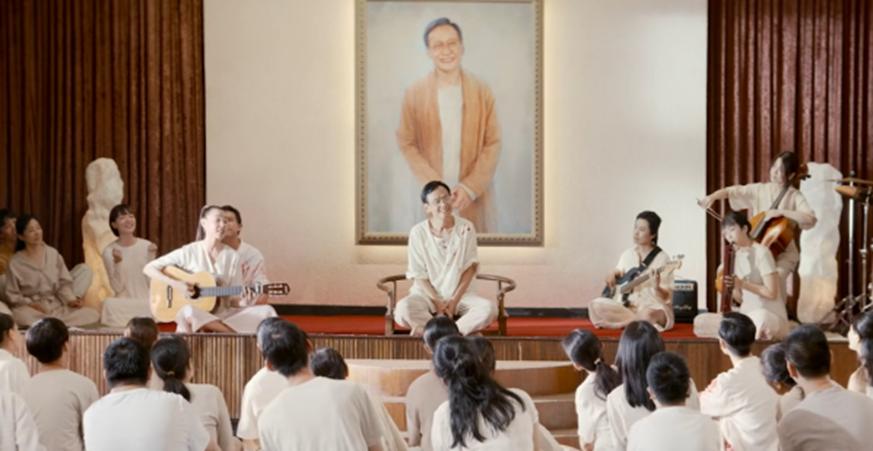 ▲《周处除三害》电影剧照庄严肃穆的大厅、巨幅画像的烘托、慈眉善目的外表……这些其实都是“尊者”为了自我神化的把戏。其实,现实的邪教主在伪装美化自身方面更加技高一筹。