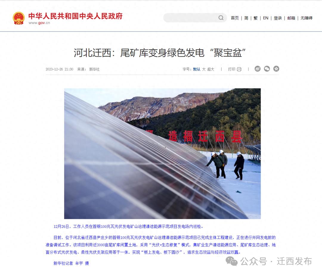 ▲新华社专题报道当初冬的阳光洒落在迁西大地,一首节能减排、绿色发展的“协奏曲”在这里奏响。河北唐山迁西100兆瓦光伏项目位于河北省唐山市迁西县尹庄乡,是唐山首个“光伏+尾矿库”项目。
