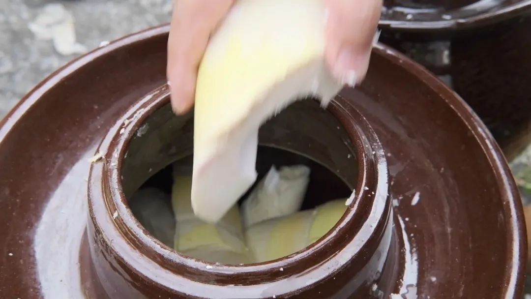 腌制酸笋。酸坛中的老酸水,其实就是保存的有益菌种。腌酸笋使用的水,是当地清冽的山泉水。新鲜的竹笋挖回来后,要抓紧时间削皮切块,当天就要浸泡到老酸坛中。因为没有添加化学成分,酸笋的腌制不能着急,发酵是一个缓慢的过程,常常需要数月乃至一年。隔年仍然吃不完的酸笋,因为有新笋添加进去,老笋就取出自然淘汰掉了。