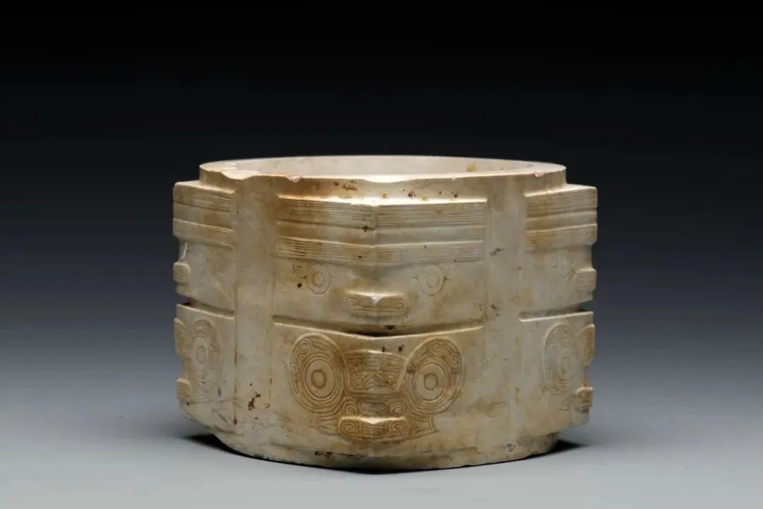 良渚文化神人兽面纹玉琮1987年采集自瑶山遗址,弧边方柱体,中间钻圆孔。每个凸面以转角线为中轴,琢刻神人兽面纹。玉琮,是一类由良渚人首创,寄托了他们的精神与信仰,并对后世礼制文化产生重大影响的代表性器物,此件玉琮制作规整,雕刻精细,打磨细致,具有极高的历史、文化和艺术价值。2