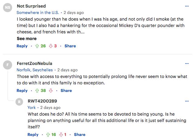 截图自MailOnline评论区显然,纷纷扰扰的意见并没有打扰布莱恩的“长生”大计。