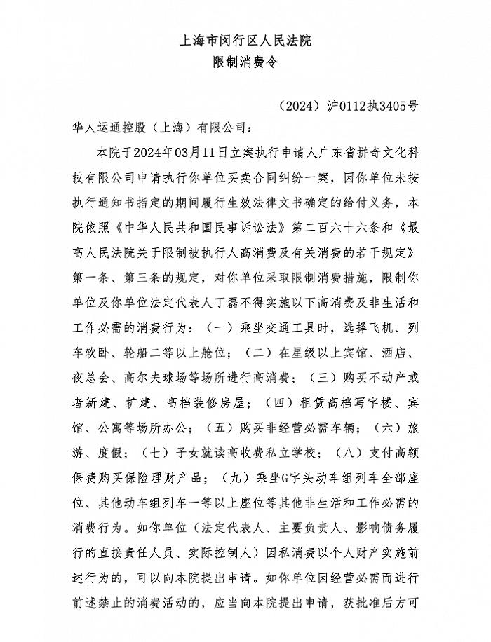 3月22日,中国执行信息公开网显示,华人运通控股(上海)有限公司及其法定代表人丁磊新增一则限制消费令,申请人为广东省拼奇文化科技有限公司,涉及买卖合同纠纷案件。
