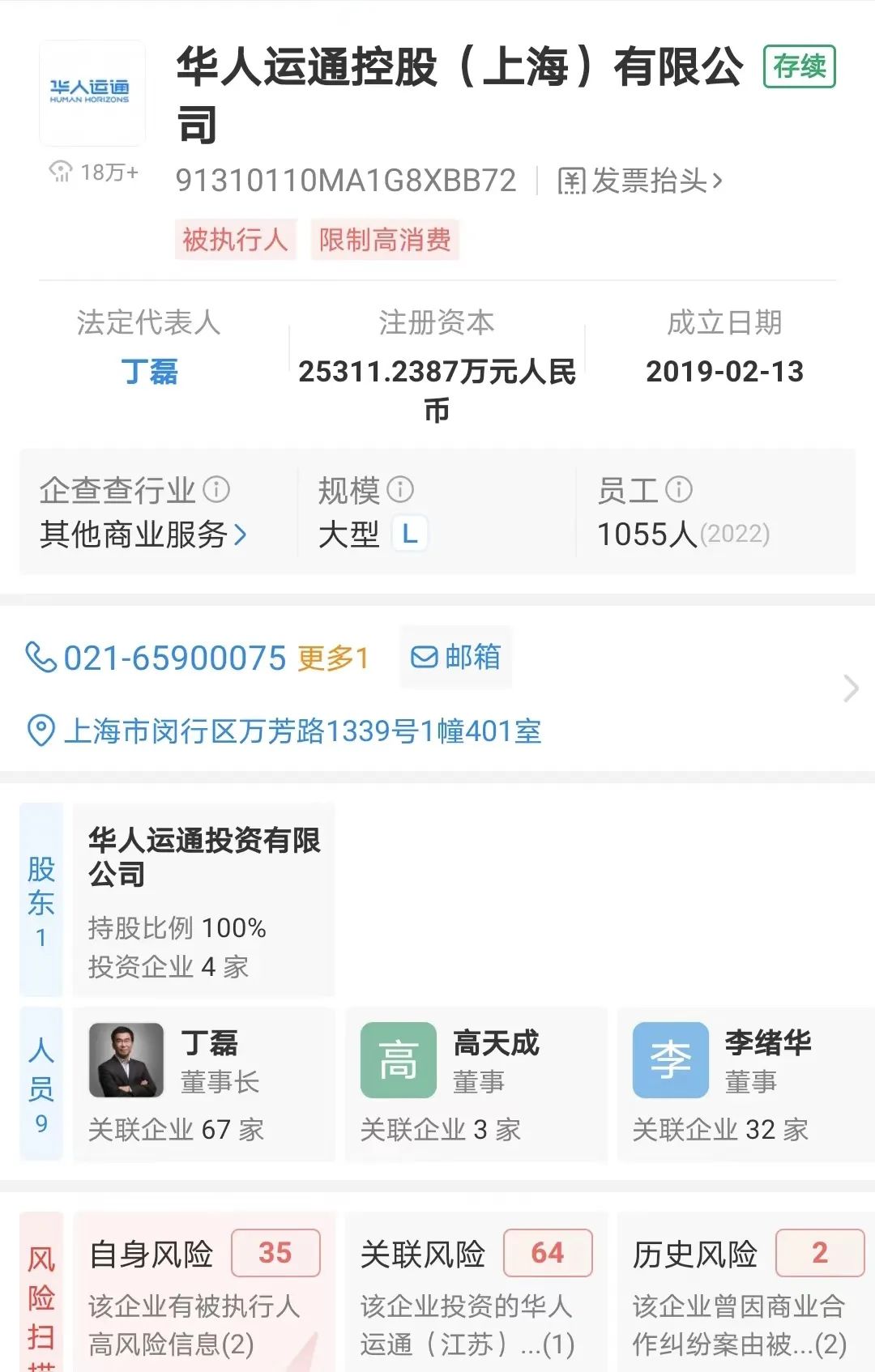 股东信息方面,华人运通控股(上海)有限公司由华人运通投资有限公司全资持股。企查查信息显示,华人运通控股(上海)有限公司现存2条被执行人信息,被执行总金额超81万元。