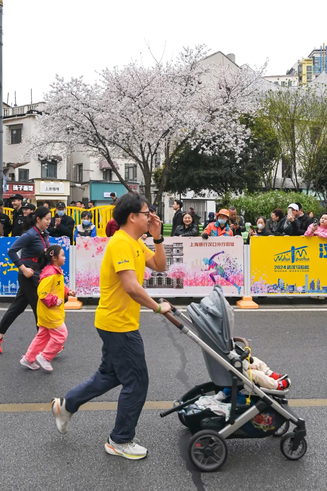 推着婴儿车跑在樱花赛道的父亲