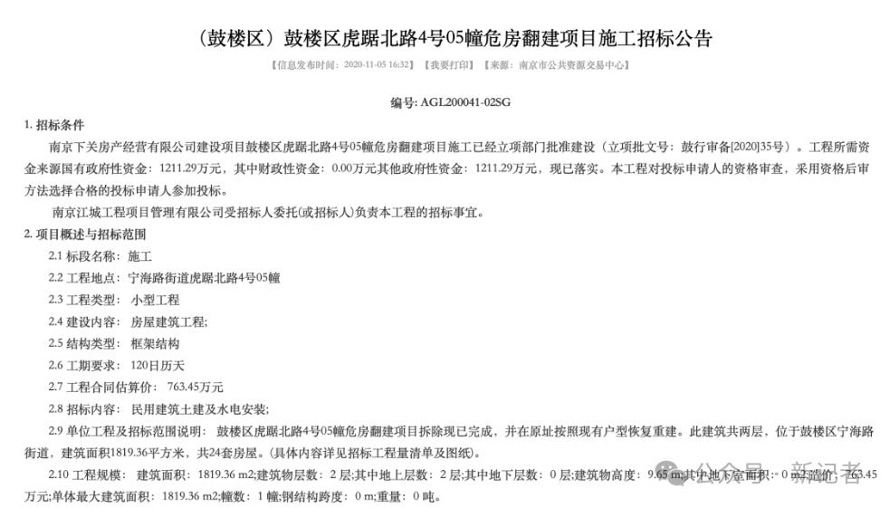 虎踞北路4号5幢施工招标公告通过南京市公共资源平台检索该项目,可以获得招标成功的房屋建筑施工单位、监理单位的信息。两项报价分别为644.460562万元、18.93万元。余下的设计、安装等环节的招标及费用依据未在网站公示。