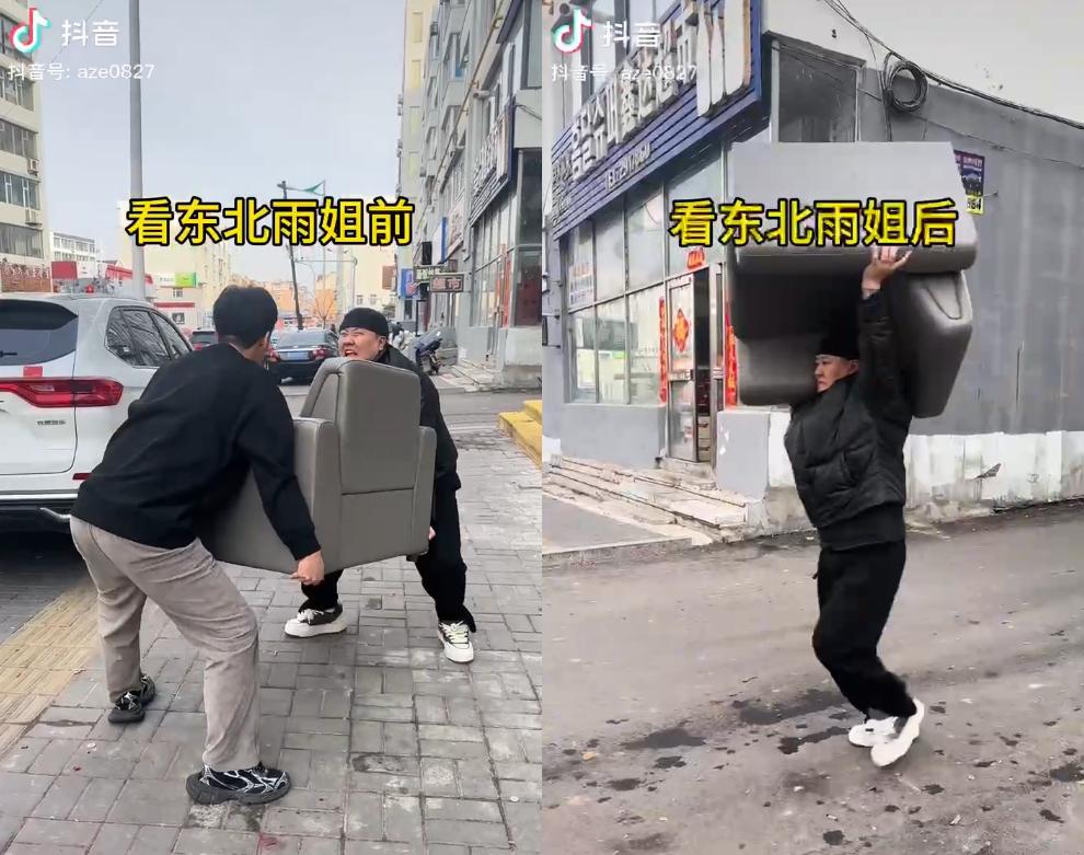 有人听之前合力抬一个沙发都费劲,小曲儿一响直接扛着沙发带头冲锋。