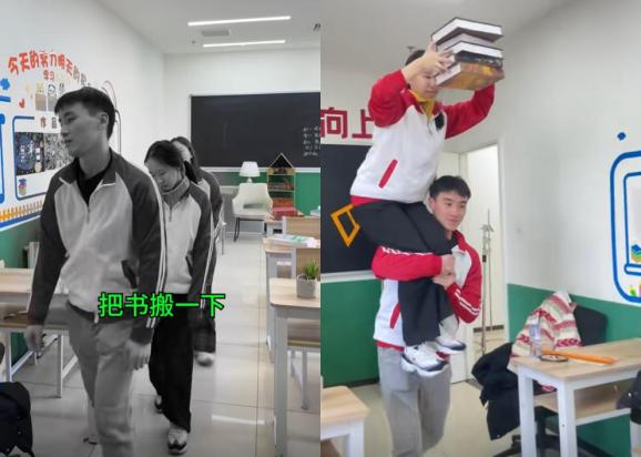 有人上学搬书没精打采,但音乐播放后,直接化身干将莫邪。