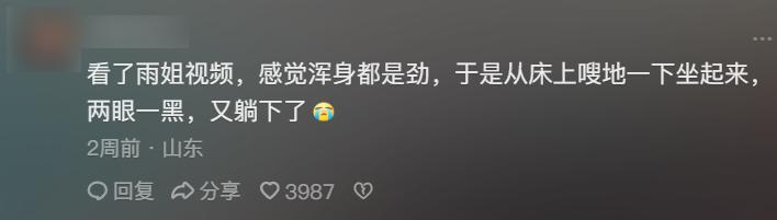 随后这句话就成了个梗,一传十十传百,雨姐便被传开了。越来越多人开始关注雨姐,然后被魔性的 BGM 和视频风格洗脑。