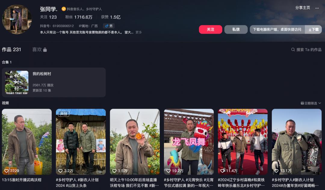 至于很多人都在猜测雨姐这波能火多久,这事谁也说不准。上一个爆火的抖音张同学,同样是通过快速剪辑+魔性 BGM 的农村生活出圈,现在已经淡出大众视线,但依然有不少自己的忠实粉丝,如果不看关注量,这个视频更新频率和数据也还算可以。