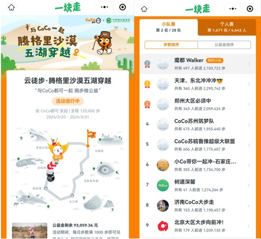 今年,CoCo再一次发起微信“一块走”捐步活动,助力绿基会“百万森林”项目。值得注意的是,CoCo五湖四海的伙伴们纷纷响应号召,组建小队共献爱心。