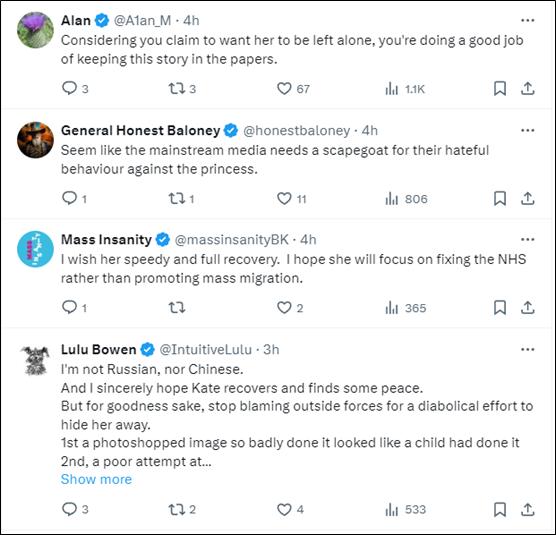 一名接受采访的英国专家称:利用舆论攻击一位年轻女士的病情,是一种极不人道的做法。不过,该专家并未说出这种针对凯特的舆论氛围和中国或其他国家有什么关联。这篇报道全文8次提及“中国”字眼时,均没有清楚说明中国到底使用了什么方式制造、扩散了涉及凯特的什么言论,更没有提供任何证据。