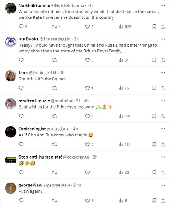 在这篇报道中,作者仅援引过往报道及消息人士的话称,中国、俄罗斯等国家此前曾对英国发起网络攻击。随后文章表示,近日在各大社交媒体平台,关于“凯特消失”的内容获得了极大的流量,随后消息人士称这种现象是由于“中俄网军在推波助澜”。