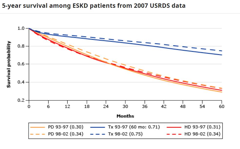 我们可以看到下图来自USRDS的数据,统计的各国腹透和血透5年生存率,红色和橙色那2根线基本是重合的,意思是腹透和血透的5年生存率没有差异。