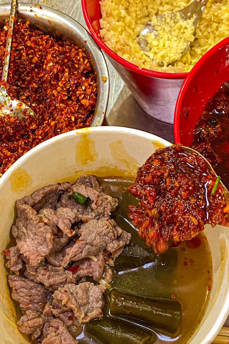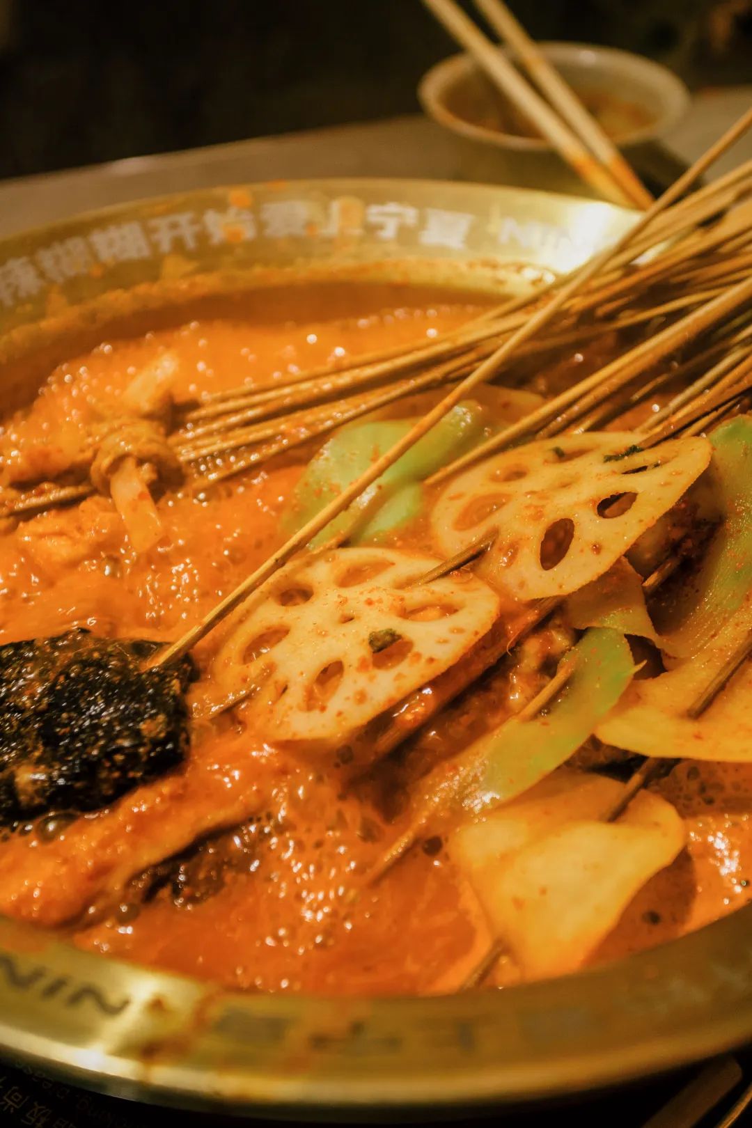 在宁夏,也有一种和延安沾沾类似的食物,叫做辣糊糊,底料也是用辣椒、孜然和其他香料制成,比延安沾沾辣得多,调好的汤底料汁浓稠,煮出来的串串也是香辣入味。还有青海西宁,这里的麻辣烫,更像一碗满满的油泼辣子,香辣鲜美。