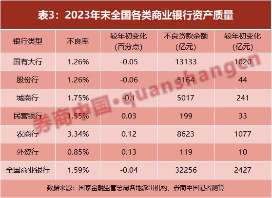 以去年不良率上升较快广东省(不含深圳数据)为例,截至去年末,该省银行业不良率为1.35%,较去年初上升0.28个百分点,不良贷款规模较年初增加661.6亿元,余额约为2357亿元,不良率和不良规模均在已披露的地区中增幅最大。同样属于经济发达地区的上海市,2023年末该项指标也出现部分反弹。2023年末,上海市银行业不良率为0.95%,较年初上升了0.16个百分点;不良贷款余额为1062.5亿元,较年初增加242.9亿元。分机构类型来看,国有大行和股份行的增幅较大,分别增加152.6亿元和95.2亿元。