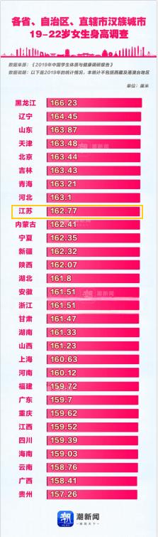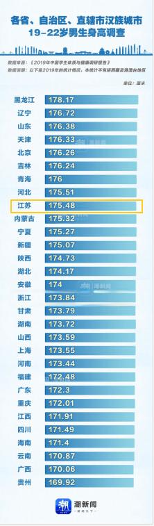 从图中可以看到,江苏19-22岁男生身高平均为175.48厘米,女生为162.77厘米。根据2022年出版的《2019年中国学生体质与健康调研报告》显示: