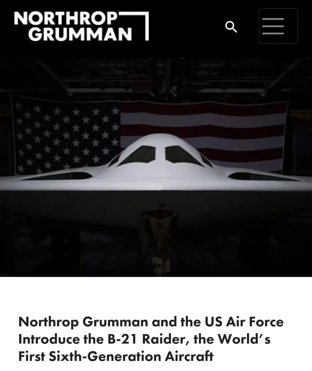 说B-21是六代机,源于诺斯罗普.格鲁曼的官网。在他们介绍B-21的页面上,有这样一张照片,照片下的说明是:诺·格和空军介绍B-21,这是世界首款第六代飞机。还有如下一段话。