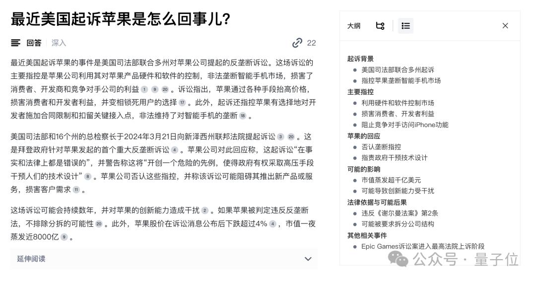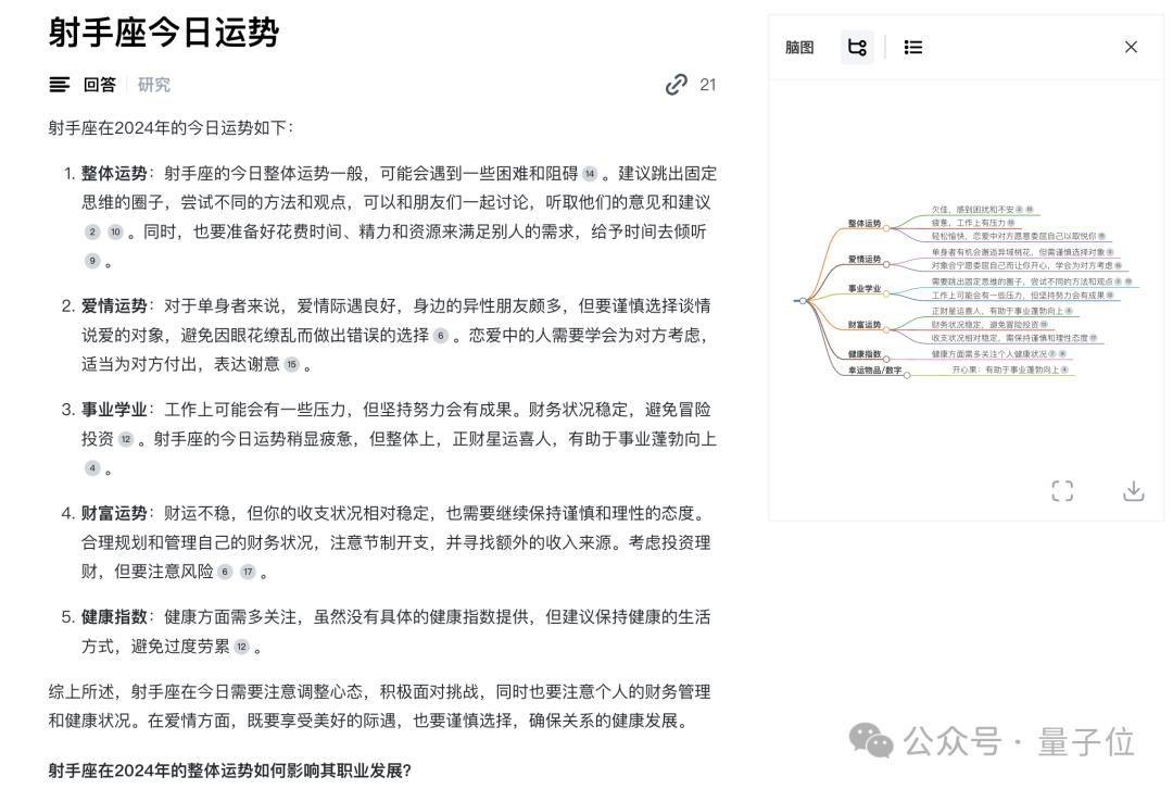 这么神奇的AI工具,我们量子位必须得试试,结果……初步的试用结论是——这玩意不仅能当普通搜索引擎来用,还能当半个办公学习神器。从思维导图到问题大纲生成,从相关事件到相关组织一应俱全……