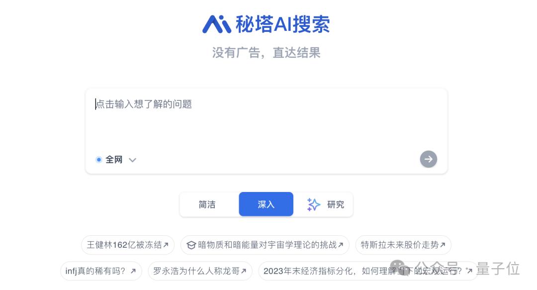 于是我们打开了这个工具,界面简洁直白,根据搜索范围可分为学术和全网两个版本,根据目标内容的详细程度,又有简洁、深入和研究三种模式可以选择。