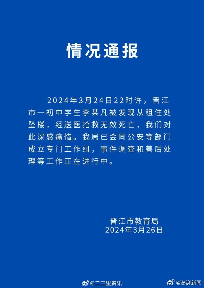 网传福建泉州晋江市某中学一女生遭遇校园霸凌跳楼身亡。今天(26日),福建省晋江市教育局通报:2024年3月24日22时许,晋江市一初中学生李某凡被发现从租住处坠楼,经送医抢救无效死亡。当地教育局已会同公安等部门成立专门工作组,事件调查和善后处理等工作正在进行中。