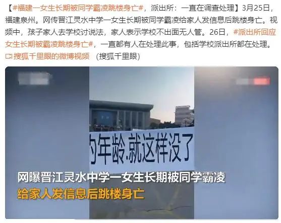3月25日,福建泉州,网传晋江灵水中学一女生长期被同学霸凌给家人发信息后跳楼身亡。视频中,孩子家人去学校讨说法,家人表示学校不出面无人管。26日,派出所回应女生长期被霸凌跳楼身亡,一直都有人在处理此事,包括学校派出所都在处理。