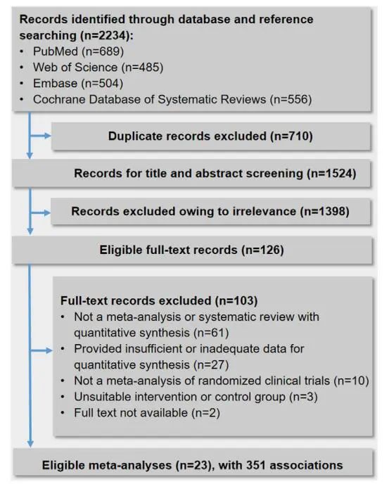 该团队系统检索PubMed、Embase、Web of Science和Cochrane四个数据库,最终纳入了23篇Meta分析进行伞状综述。通过对纳入文献的质量评估和GRADE评级,发现大部分Meta分析具有较高的可信度,且提供了中等至高质量的证据。