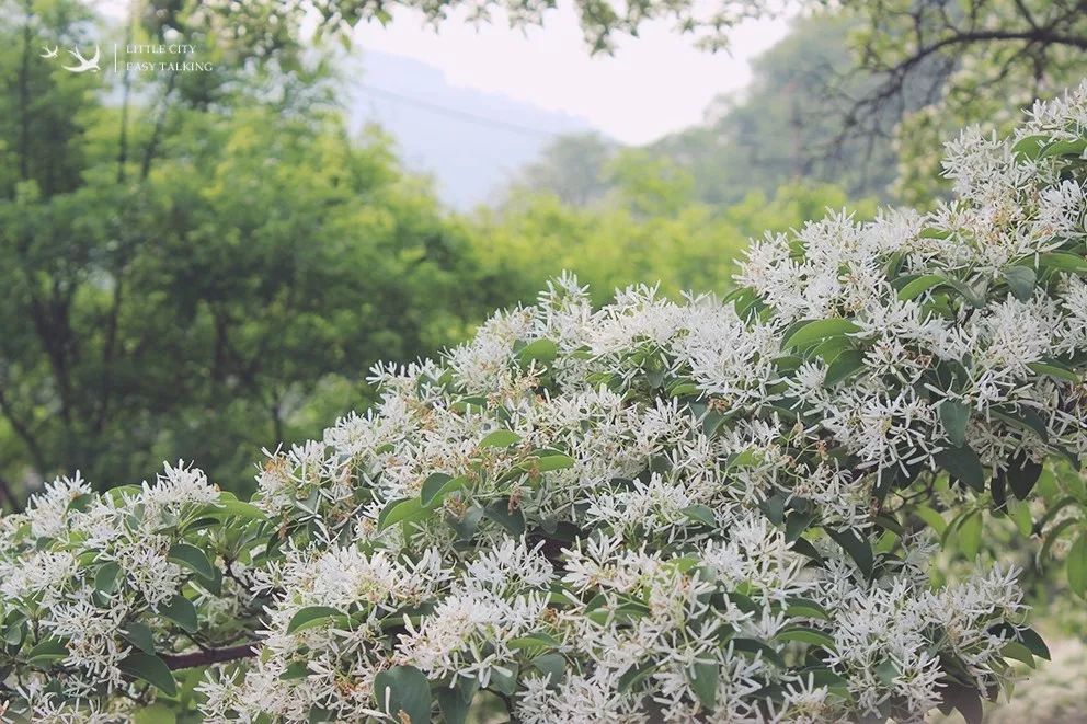 流苏,俗称四月雪,花期有十天左右。淄川土泉村这棵流苏树据说已有两千多年历史,每年4月—5月,流苏盛开,古树枝繁叶茂,远观满树白花、如雪压树;近看花形羸弱纤细,苗条若斯,一朵朵,一片片,连绵而起、覆霜盖雪;似伞盖,如浮云,随清风飘荡;一缕缕,一丝丝,清香袭人,虽不如富贵名花的香气袭人,却胜在淡雅。