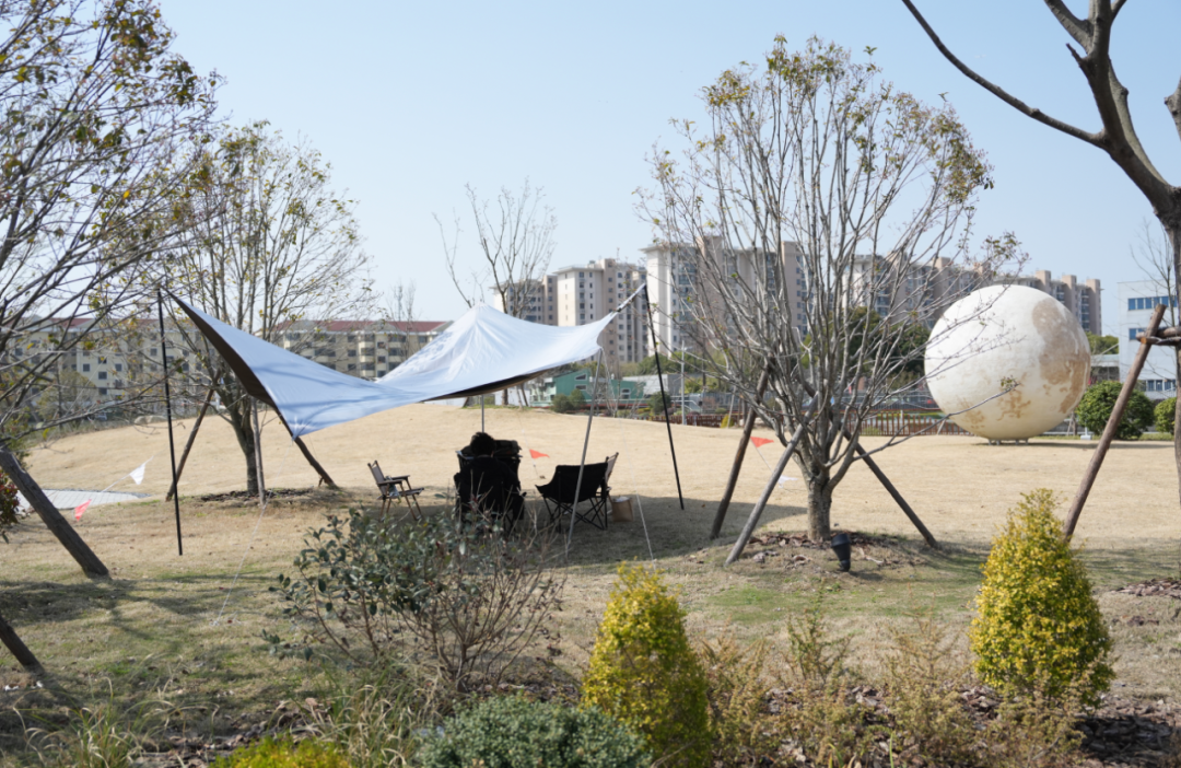 岸线公园二期内设的“月球区”是普陀区可以搭设帐篷的公园绿地之一。该区域因为地形好加上毗邻苏州河,使得这块占地仅1500平方米的露营区从开园第一天起就成为了最受欢迎的景点,被不少市民网友亲切地称呼为“网红公园”“最美露营点”。