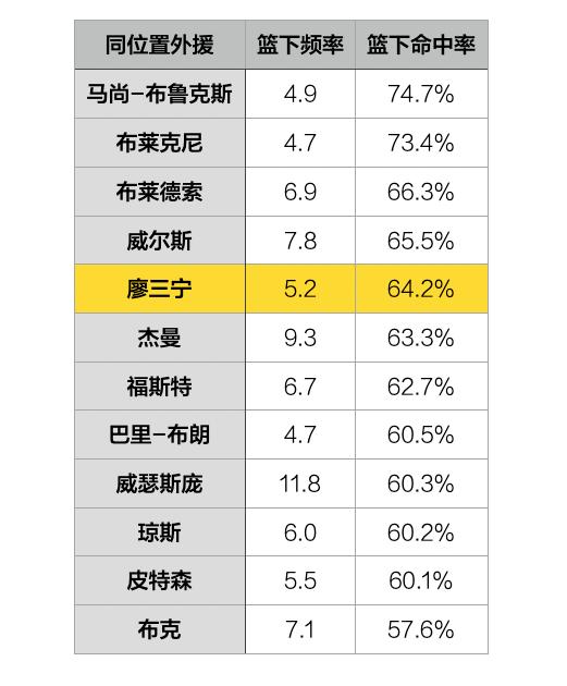 既然我们是要把廖三宁当作小外援去使用,那么也不妨把他和小外援一起对比。而通过下表我们可以看到,即便是和同位置的外援对比,廖三宁在篮下的终结效率也是平均水平往上的行列。