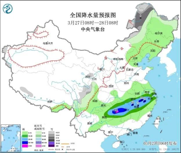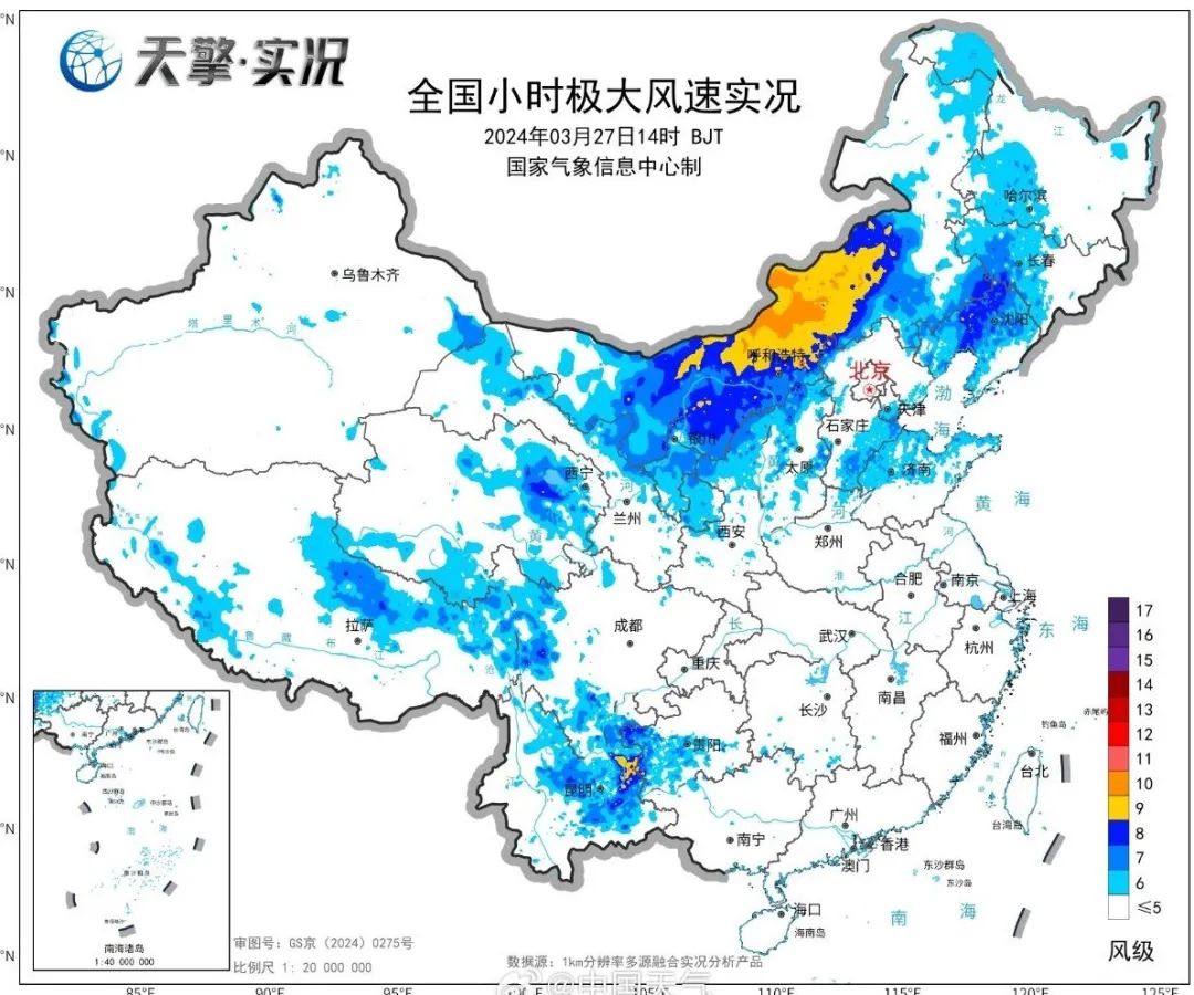 27日14时大风实况和全国沙尘天气预报图预计3月27日14时至28日14时,贵州东部、广西北部、湖南中部和东北部、湖北东南部、江西北部、安徽南部、浙江西部等地部分地区有大到暴雨,其中,湖南西部等地部分地区有大暴雨(100~120毫米)。湖南中北部和西部、江西中北部、浙江南部、福建西北部、贵州中南部、广西北部等地的部分地区将有8-10级雷暴大风或冰雹天气;安徽南部、湖北东南部、湖南、江西、浙江、福建西部和北部、贵州中东部、广西北部等地的部分地区将有短时强降水天气,最大小时雨量20-40毫米,局地可达50毫米以上。