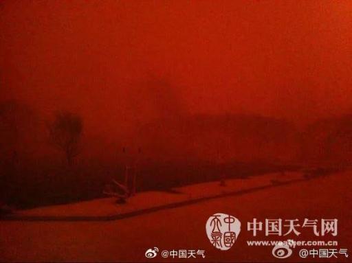 @中国天气 解释称:因为此时空气中充斥大量沙尘颗粒,太阳光里大部分蓝紫短波被散射掉了,能穿过的大多是红橙的长波,所以看起来橙黄橙黄,甚至有时看起来偏红。下图为2014年4月23日甘肃敦煌地区出现特强沙尘暴,拍到的从黄色到红色,最后几乎完全漆黑看不见天空,而当时拍摄时间是下午。