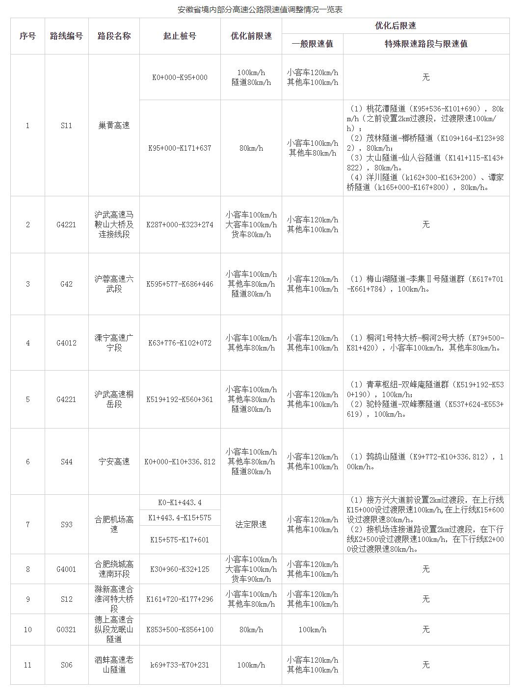 为进一步提升我省高速公路通行能力,更好地服务经济社会发展和人民群众便捷出行,根据《安徽省高速公路优化限速工作指导意见》等文件要求,安徽省交通运输厅、安徽省公安厅决定自2024年3月26日起,对巢黄高速、沪武高速马鞍山大桥及连接线段、沪武高速桐岳段、沪蓉高速六武段、溧宁高速广宁段、宁安高速、合肥机场高速等7个路段及合肥绕城高速南环段、滁新高速公路淮河特大桥段、德上高速合枞段龙眠山隧道、泗蚌高速老山隧道等4处点段限速值进行调整,相关路段沿线的限速标志、标线、交通技术监控设备参数等同步进行调整。具体调整路段情况见附表。