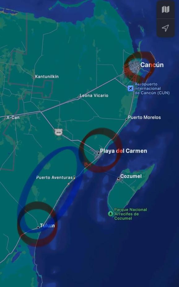 红圈从北到南分别是坎昆(Cancun),Playa Del Carmen,还有Tulum,蓝圈是大概要去的洞穴的区域,如果想去洞穴潜水,大家可以选择住在Tulum附近。Dos Ojos