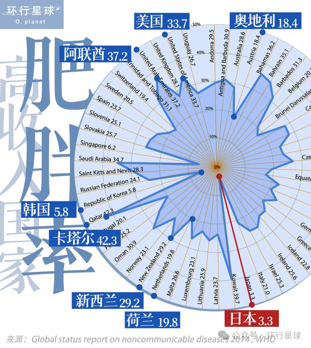 根据世界卫生组织2014年的报告,日本的成年人肥胖率(BMI大于30的比例)在高收入国家中排名最低,只有惊人的3.3%。而中国的成年人肥胖率是6.9%。
