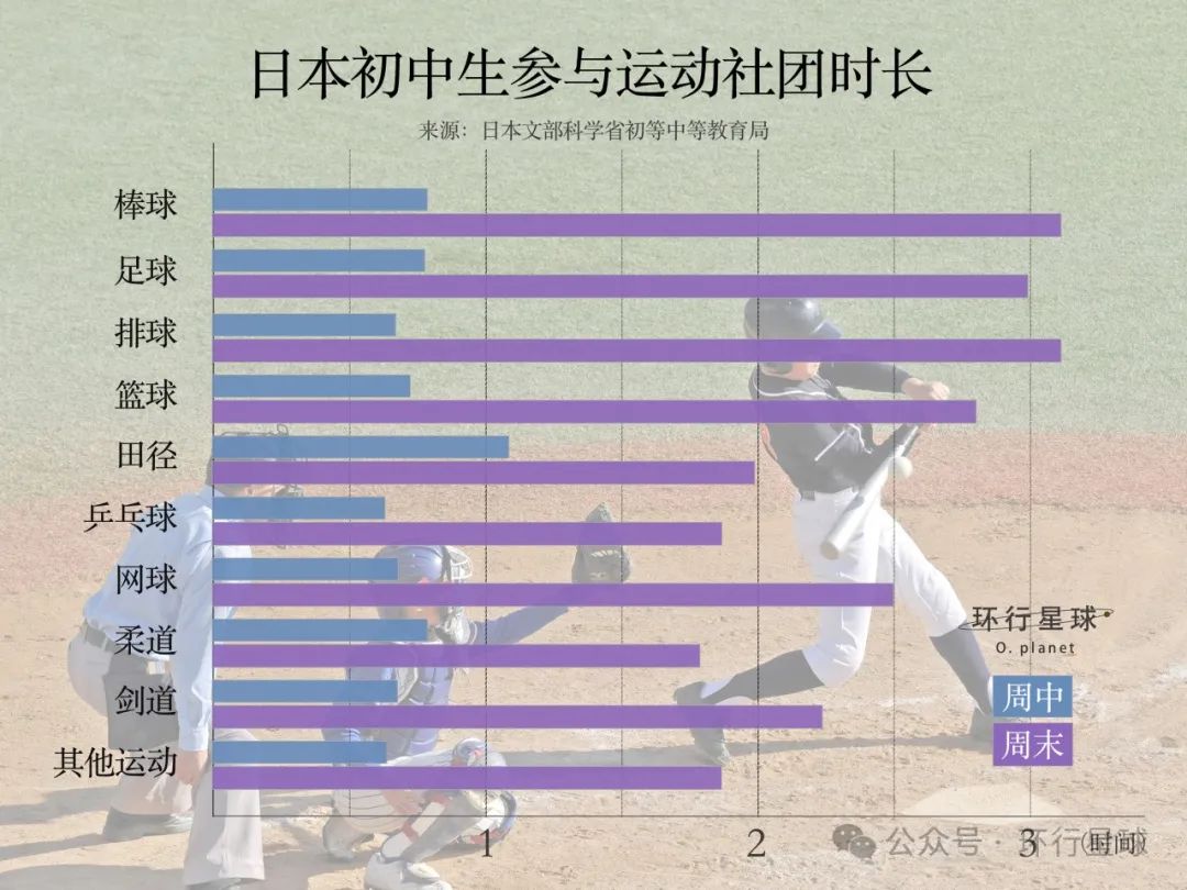 初中的运动社团活动时间在周一到周五每天40-60分钟,周末的训练时间大约为3小时。日本的体育文化氛围浓厚,几乎全民参与。从小学开始,学校就开展了各色社团活动,人气较高的运动包括棒球、网球、足球和弓道等。日本的学生在体育社团上会投入难以想象的热情。