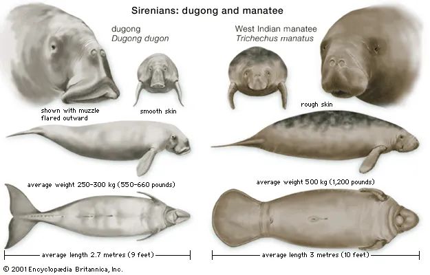 儒艮(左)与海牛的对比(图片来源:britannica.com)值得一提的是,儒艮也曾经生活在我国的水域,甚至在广西合浦还设立有儒艮国家级自然保护区。不过因为种种原因,儒艮已经在我国功能性灭绝了。